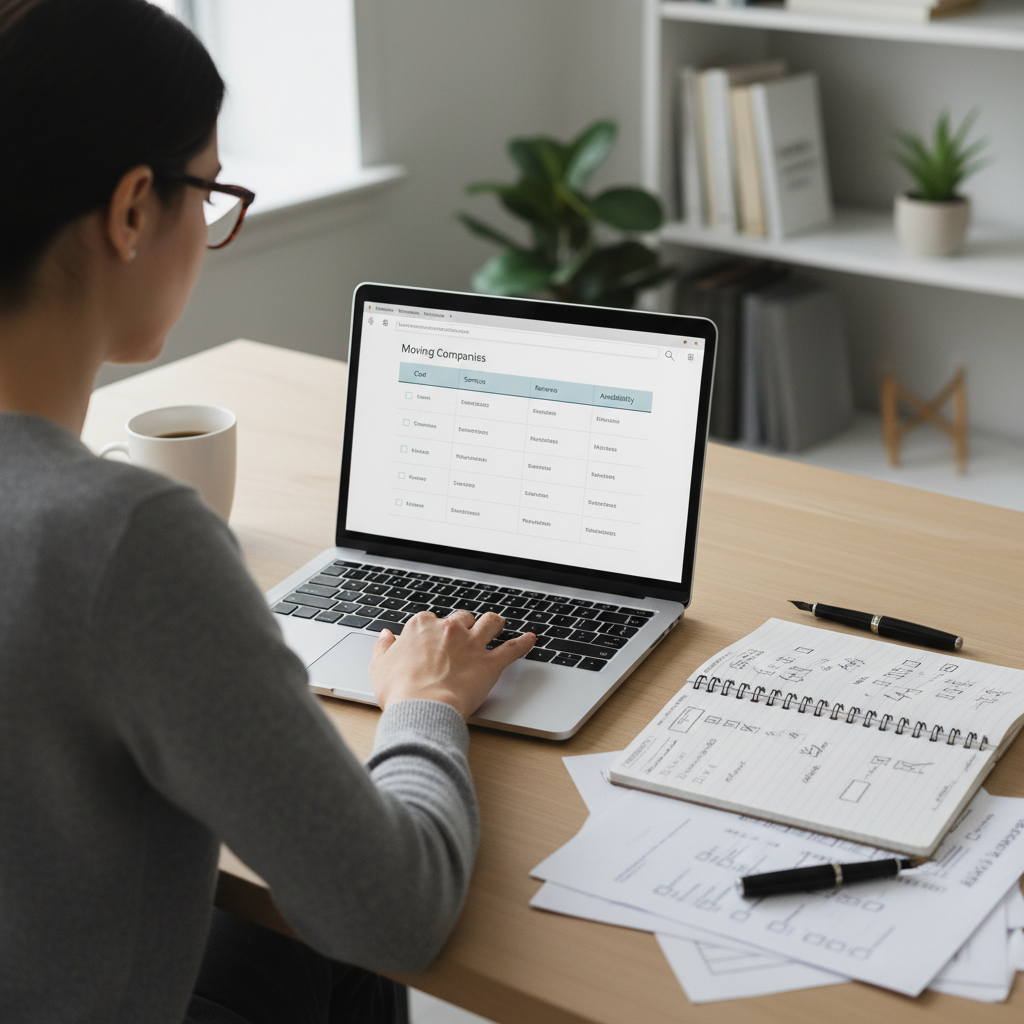 Osoba szuka firmy przeprowadzkowej online na laptopie.