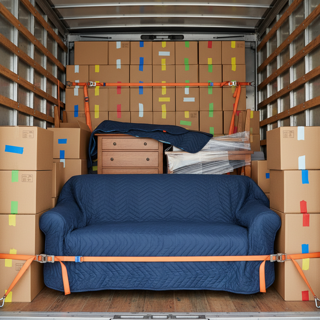 Zabezpieczony ładunek w samochodzie przeprowadzkowym.