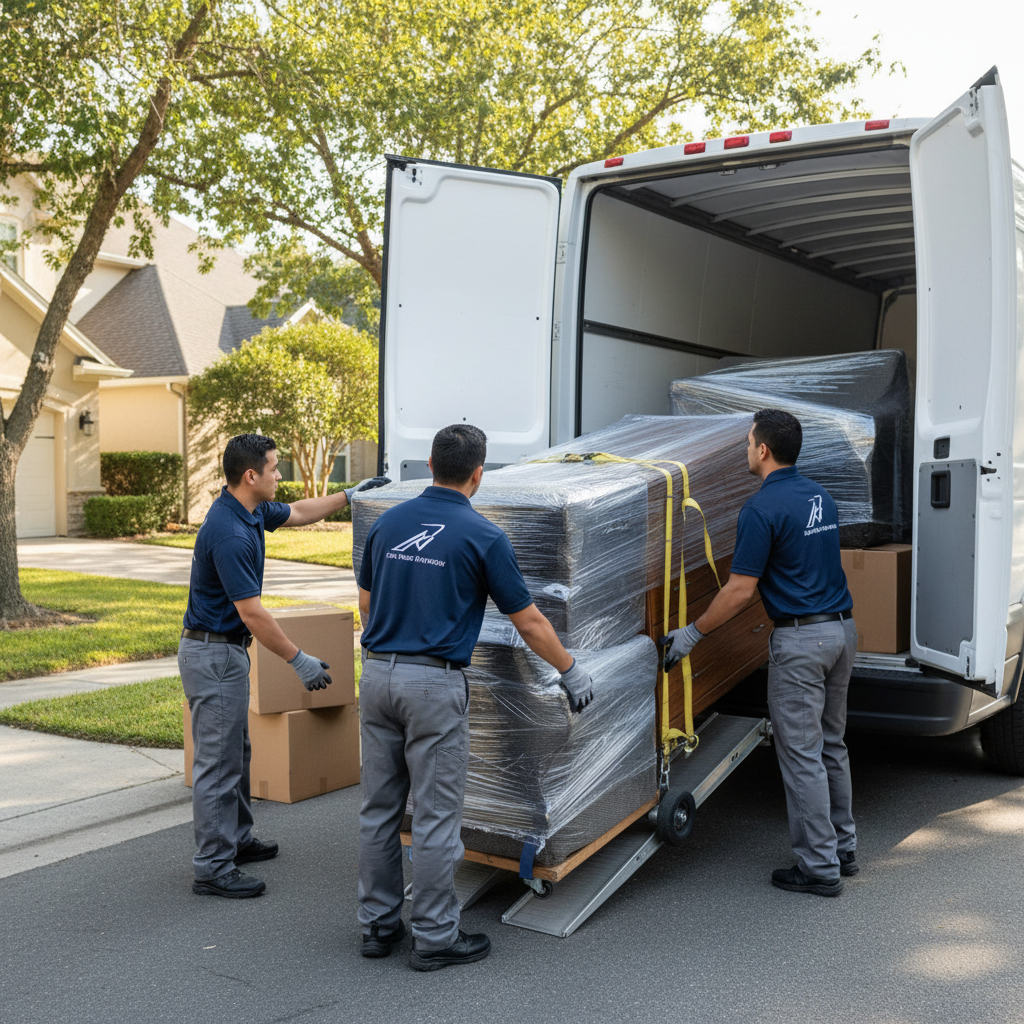 Profesjonalna firma przeprowadzkowa ładuje zabezpieczone mienie do furgonetki.