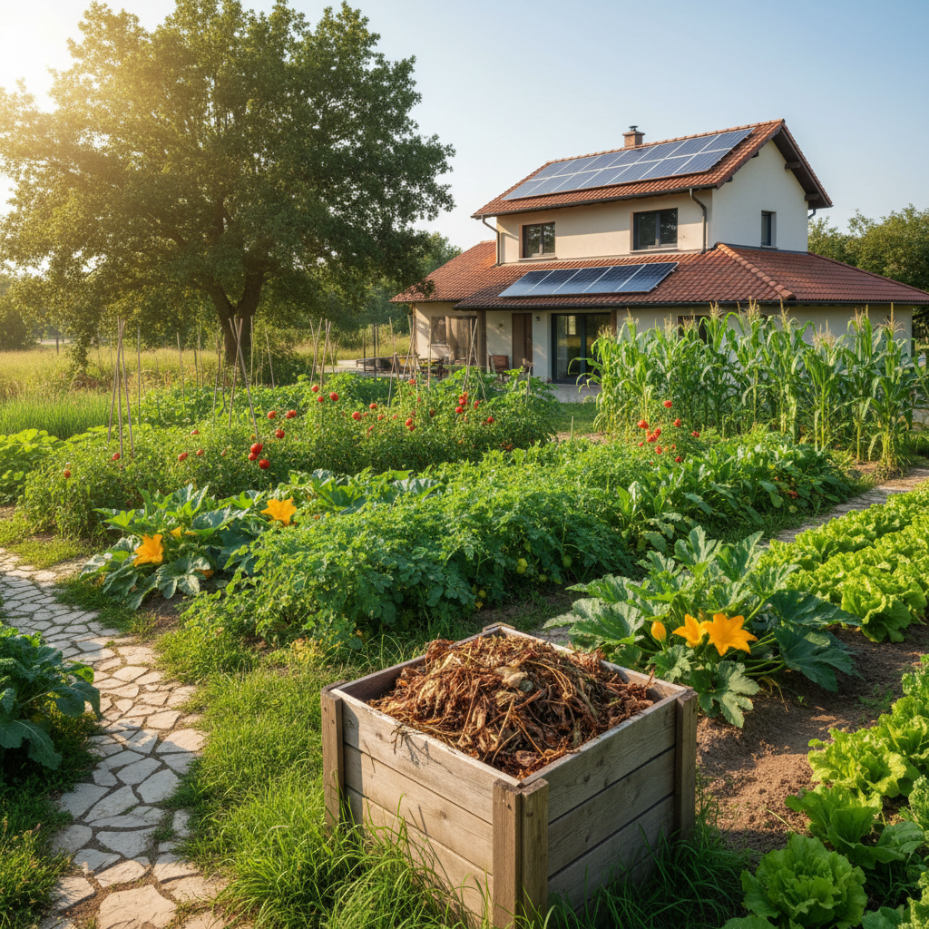 Na wsi segregacja odpadów jest kluczowa, ale masz też szansę na własny kompostownik. Odpady organiczne zamieniają się w cenny nawóz pod rośliny, co symbolizuje zamknięty obieg materii w Twoim gospodarstwie.
